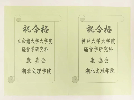 (外院通讯员呙小云)昨天从日本大和语言教育学院传来喜讯,外院日语系康嘉会、宋瑜微、朱琪琪3名同学被日本名校录取为硕士研究生,其中,康嘉会同学同时被立命馆大学和神户大学经济学院录取,宋瑜微被名古屋大学人文学院录取,朱琪琪同学被国学院大学文学院录取。