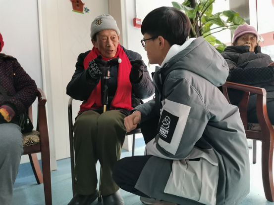 (外院青联志愿者与老人谈心 照片来源 石毅辉)
