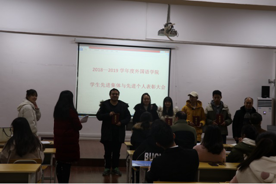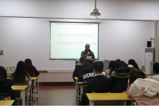 副院长袁在成宣读《关于表彰2018-2019学年度学生先进集体和先进个人的决定》,并代表全体教职员工向受表彰的学生先进集体和个人表示热烈祝贺,同时指出一年以来,外院在学校各级领导和同仁的关心指导下取得了丰硕的成果,涌现出一大批德才兼备的优秀学子。社会需要方方面面的人才,能在每个阶段立足把自己的学习、工作干好,能为社会做出应有贡献的人就是一位优秀的人才。他殷切希望外院学子能见贤思齐,以此次表彰大会为契机,树立远大志向,刻苦奋斗,不负众望。马晶晶老师宣读《关于表彰湖北文理学院第十四届外语文化节先进个人的决定》。
