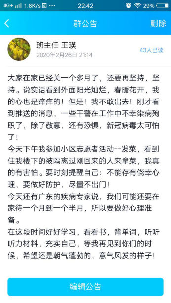 王瑛每隔一段时间都会写给同学们写一些鼓励的话,跟同学们分享优秀的抗疫作品,分享居家防疫知识,分享自己疫情期间的心得体会,鼓励同学们以积极的心态投入学习和生活,相信党,相信国家。