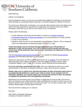 吴苇航收到的四所大学录取通知书分别是:QS世界大学排名90的伯明翰大学;QS世界大学排名92的利兹大学,QS世界大学排名103的诺丁汉大学,以及QS世界排名134的纽卡斯尔大学。阿博程同学申请的南加州大学全美排名27,安纳伯格传播学院(2015-2019)QS世界专业排名第一。