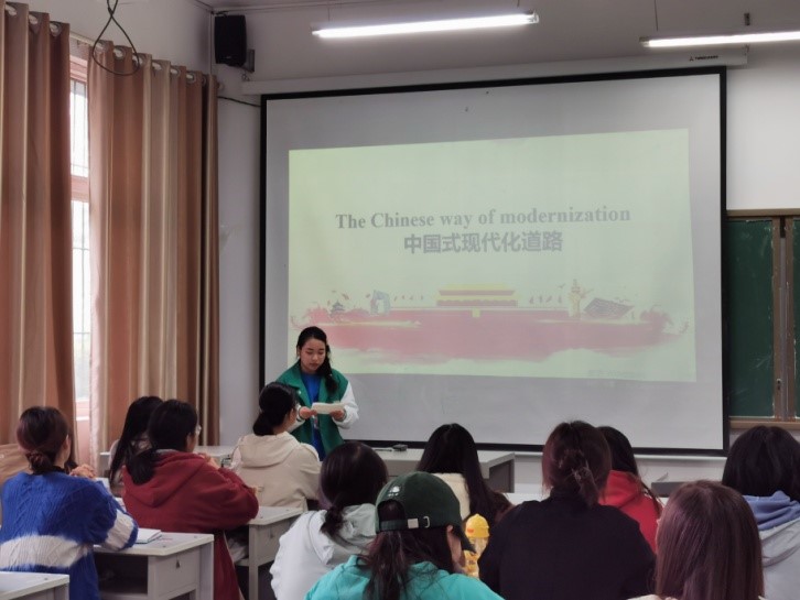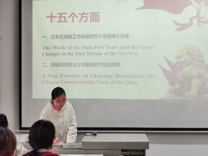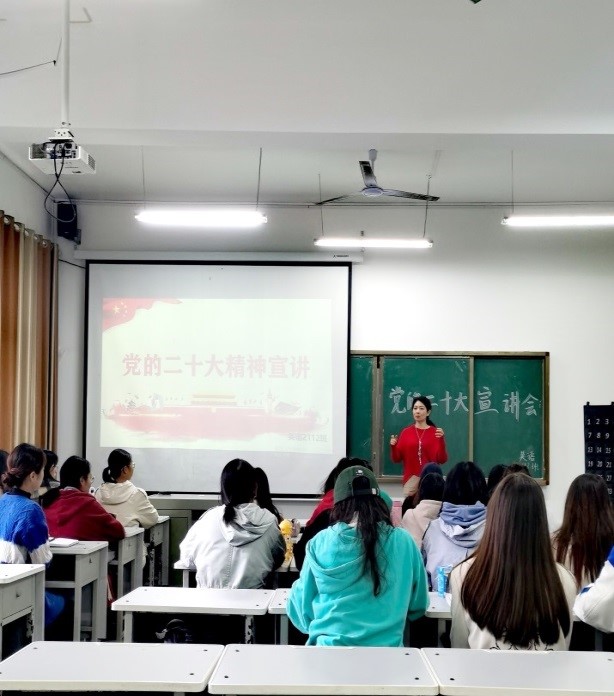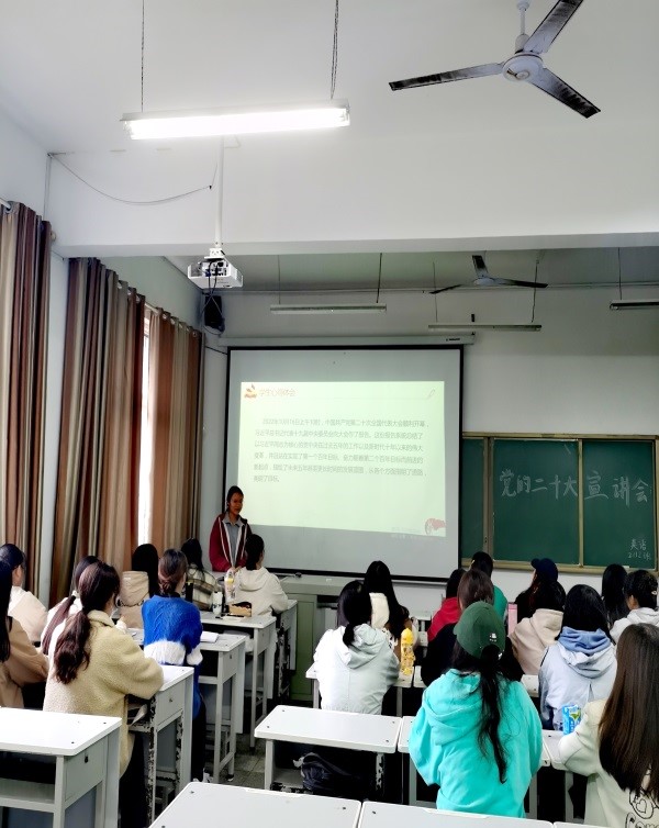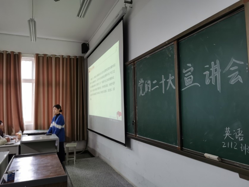 主题班会上,郭文雅、王欣然同学分别领学了党的二十大报告中英文对照本,同学们共同学习了解党的二十大主题、新时代新征程中国共产党的使命任务、中国式现代化及其本质要求、必须牢牢把握的重大原则等重大理论和实践问题,明确了两步走的战略目标任务,尤其是习近平总书记在报告中对新时代青年提出的期盼,同学们纷纷表示,学习之后受到极大的鼓舞,决心奋发图强。