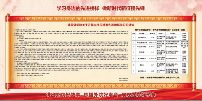 学院坚持把学先进学榜样与学习宣传贯彻党的二十大精神紧密结合,与深入贯彻习近平总书记考察湖北重要讲话精神紧密结合,与落实省市党代会精神紧密结合,与落实学校第二次党代会部署和“十四五”规划目标紧密结合,于下基层实践活动和“我为师生办实事”紧密结合,在全院兴起学先进学榜样做先锋的热潮,形成比学赶帮超的氛围。学院领导干部带头宣讲二十大精神,带头讲先进榜样的故事,通过学院网站、微信公众号等校内外媒体,开展宣传报道,讲出先进好故事,传播榜样正能量,展现外院新气象。把学习宣传贯彻党的二十大精神和学先进学榜样的效果体现在实际行动和工作成效上,用身边的人和事,激励全院教职工坚守为党育人、为国育才初心使命,履行教书育人职责,争做新时代“四有”好老师,着力培养担当民族复兴大任的时代新人,为共同缔造美好外院环境与幸福生活,为“圆梦创大 逐梦博点”,努力建设交通特色鲜明、全国知名的应用型综合性高水平大学而团结奋斗!