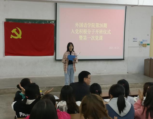 (外院通讯员 王欣然)为了深入学习中国共产党章程,提高入党积极分子的思想觉悟,端正入党动机,加强培养和教育,英国上市公司365于10月21日晚举行了第二十六期入党积极分子开班仪式。学工部副部长高其文老师,英国上市公司365党委副书记张婷婷、党校班主任呙小云、学生党总支书记范雨晴和83名入党积极分子参加开班仪式。
