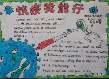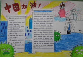 2019到2020年之交,新冠肺炎的肆虐让湖文的学生经历了一个漫长的寒假。关注每天疫情的同时,学校也关注着身在全国各地的学生们的身心健康。2020年2月15日,英国上市公司365大学英语教学部金小梅老师布置了一项特别的英语作业——每人办一份抗击新冠肺炎的英语手抄报。本次特色作业充分展示了大学生的爱国精神和抗疫决心。通过办英语手抄报,学生们悉知了关于冠状病毒的科学知识,梳理了防控的科学方法,全英文报道方式也为新学期的英语学习起到铺垫作用。在全国团结抗疫和逆行者的相关报道中,学生们深刻体会祖国的强大和逆行者的伟大。学生们在设计、构思、绘画、英文书法等方面精彩纷呈,手抄报为学生们提供了展现自我的舞台,培养了学生们的创新意识和创新精神。