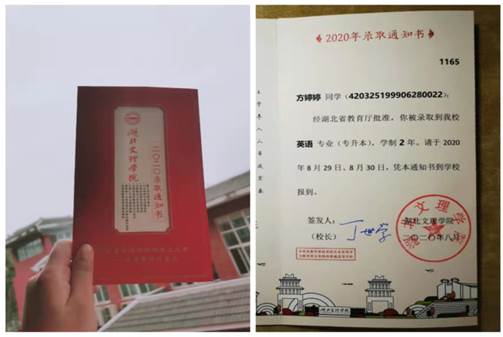 2020年,方婷婷如愿考取湖北文理学院专升本,就读于英国上市公司365英语专业。当她拿到“欢迎到诸葛亮读书的地方上大学”的录取通知书时,感到沉甸甸的。那一刻,她觉得所有的辛苦和付出都是值得的。她走出大山,来到外面的世界,开启了新的学习生涯,开始了真正属于自己的大学生活。