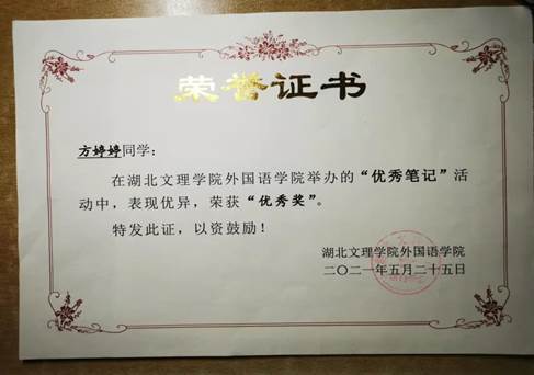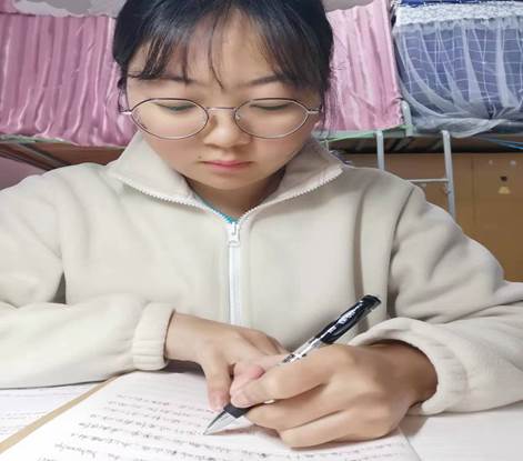 在湖文,她如饥似渴,刻苦学习,汲取智慧,充实自我,她连续两年获得奖学金。每天上下课时,都能在外院的文化墙上看到优秀的学长学姐们的励志成功故事,标兵的影响对她产生了极大的激励和鼓舞。在学好专业知识的同时,她经常去图书馆,主动涉猎多方面的学习资源,拓展知识面,不断充实提升自己。她坚持每天早起背单词,白天阅读、做笔记,晚上自习、刷题。她说:“学习是自己的事情,自己才是最大的受益者。多学一点,有备无患。”桌前那一摞摞的复习资料,做过的那一张张试卷,练过的那一道道习题,记下的那一页页笔记,都见证了她的辛勤付出,化作了希望的火种,燃烧着她的青春,点亮了她前行的路。