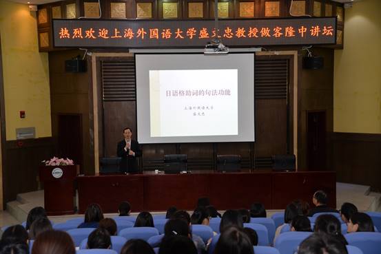 盛文忠从日语的语言类型以及日语格助词的性质为同学们阐释了日语的句法结构,并列举了一系列生动形象的例子,帮助同学们进一步了解日语格助词的用法及功能。在详细甄别格助词的过程中,盛文忠引导师生们以发散式思维深入语言学习,探讨认知语言学的奥妙,其新颖独到的见解征服了在场的老师和同学们。