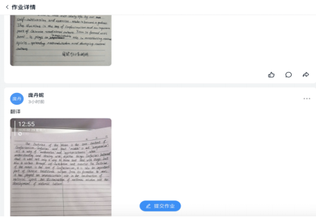 利用“圈子”功能 布置作业、发布通知。“圈子”是钉钉推出时间不长的功能,对于高校教学来说,最方便的是下属的“作业”功能。对大学英语教师来说,布置翻译和写作类作业的必需的。钉钉的“作业”功能可以让学生方便地上传图片、文档或文字,自动统计提交情况,教师可以点赞、转发、评论,也可以选择优秀作业进行展示,对于英语主观题目来说是一个较为理想的提交途径。