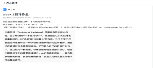 线上答疑交流。学生对教材的主要学习可以在超星学习通和Unipus上进行,但以上平台的答疑就没有那么方便了。学习通平台也提供了直播功能,但由于使用人数和服务器原因,不建议教师进行直播。钉钉的技术支持保证了比较稳定的直播环境,因此必要的答疑和讲解环节我会选用钉钉直播或文字、语音直播的方式进行。同时,响应学校的号召,尽量缩短直播时间、减少直播次数,在和学生沟通后确定每周直播一次、时长半小时左右,对本周的作业和学生提出的问题进行集中讲解。钉钉直播支持联播和回放功能,因此教师可以同时给多个班级直播答疑,个别网络不稳定的同学也可以通过收看回放,及时掌握教学内容。