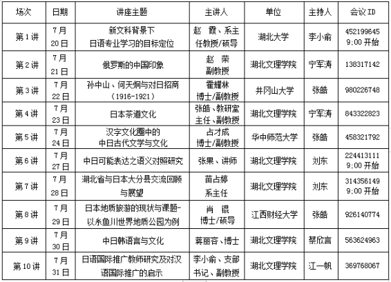 以与日本欧亚财团达成的国际合作项目为契机,积极开展学术交流活动,邀请了湖北大学、井冈山大学、华中师范大学、江西财经大学、湖北文理学院等高校的日语教师,在线为广大学生开展日本文化类系列讲座10场,开阔了学生们的文化视野,加深了校际之间、师生之间的交流互动,取得了很好成效。沙龙邀请了日语教指委委员、湖北大学博士生导师赵霞教授主讲,为学生定制文化大餐,深受欢迎。