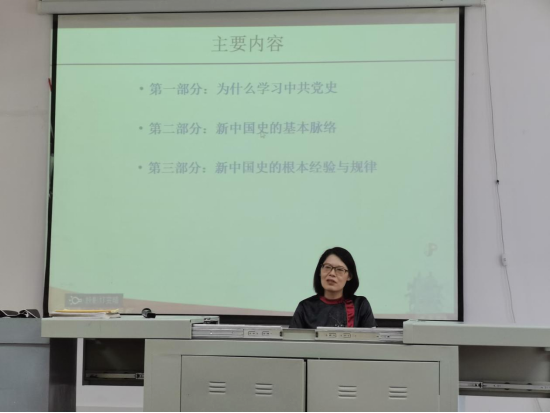 熊明秀以“学党史,悟思想,强信念,为实现中华民族伟大复兴奋勇前进”为题,从为什么学习中共党史,新中国史的基础脉络,新中国史的基本经验与规律三个方面进行了阐述。