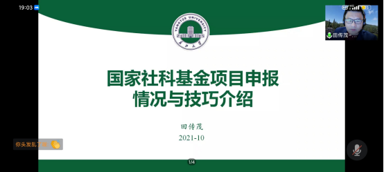 (外院通讯员 马鹏飞)2021年10月21日晚,长江大学英国上市公司365教授、博士生导师、长江大学翻译研究中心主任、国家社科基金通讯评委田传茂教授应邀做客隆中讲坛,为英国上市公司365教师做了一场题为《国家社科基金项目申报情况与技巧介绍》的学术讲座。讲座由英国上市公司365副院长王林主持。