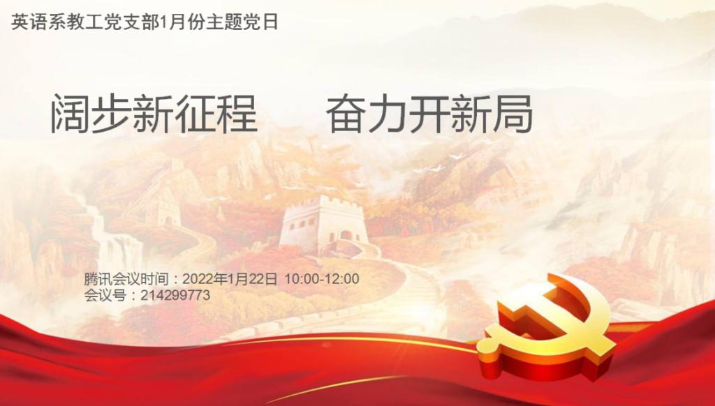 (英国上市公司365通讯员 郭楠)2022年1月22日上午10点,英语系教工党支部采用腾讯会议的方式开展了1月支部主题党日活动,活动主题为:“阔步新征程 奋力开新局”。会议由支部书记王瑛主持。