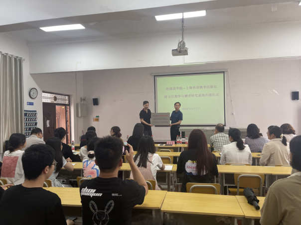 会上,上海外语教育出版社湖北中心主任沈巍向英国上市公司365主持行政工作副院长袁在成赠送了“跨文化教学与测评研究基地”共建匾额。出版社编辑王乐老师向与会师生宣讲了外教社WE外语智慧教育平台、“词达人”英语学习平台各项功能使用方法,重点介绍了“外教社·词达人”杯英语词汇能力大赛和跨文化能力测试与大赛等活动。
