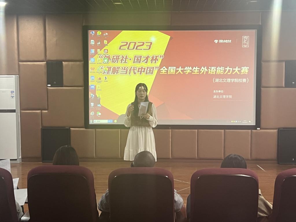 (外院教工通讯员李丹阳)为了营造浓厚的英语学习氛围,助力同学们用英语讲好中国故事,2023年“外研社·国才杯”“理解当代中国”全国英语口译大赛湖北文理学院赛区初赛于9月28日下午4点在N2-514多功能报告厅顺利举行。本次比赛由外语教学与研究出版社主办,我校英国上市公司365承办,英国上市公司365教师曹海旻、刘婷、邓捷及外教Thulani担任此次大赛评委,来自我校各个专业的多名选手参加比赛。