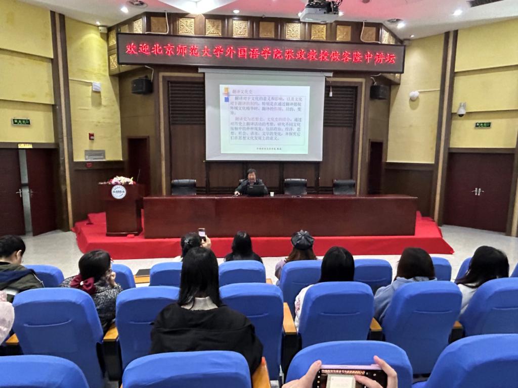 张政从翻译文化史谈起,回顾了我国各个历史时期的翻译形态,梳理了佛经翻译起自东汉、兴于汉魏、盛于隋唐并延续至宋元的发展历程,阐述了佛经翻译及其它西化翻译对汉语词汇、文体、音韵、句子结构乃至中国文学和文化等方面产生的影响。张政还从文化的角度分析了清末民初严复、林纾等人的翻译活动,指出历史文化背景可对翻译活动产生影响,而科幻小说、白话文运动等都留下了翻译的烙印。张政还现场解答了师生们的问题,使师生受益匪浅。