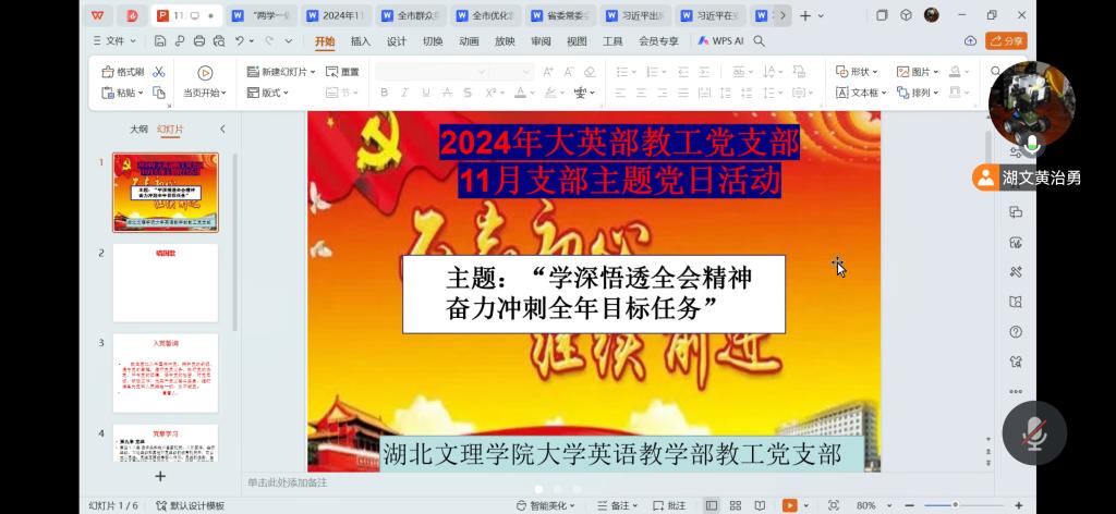 (外院通讯员李倩)2024年11月28日晚上,大学英语教学部教工党支部通过腾讯会议开展11月支部主题党日活动。本次活动主题为:“学深悟透全会精神,奋力冲刺全年目标任务”。活动由支部副书记黄治勇主持。