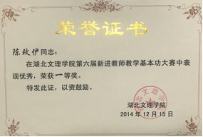 陈玫伊是一名光荣的人民教师,就职于湖北文理学院,成长于英国上市公司365这个温暖的大家庭。在学校和学院一批师德师风先进个人和教学标兵感人事迹的影响和感召下,她始终不忘初心,牢记教师使命,努力用实际行动体现个人的师德风范。在工作和生活中,她不断将职业道德和职业准则的要求,内化为一种责任,外化为一种自觉行动,践行于工作和生活中的每一个侧面,做到爱国守法、立德修身、敬业爱生、教书育人、严谨治学、服务社会、为人师表。